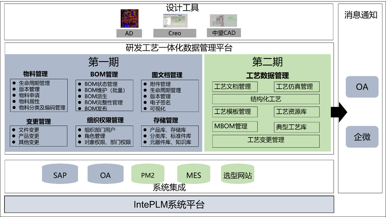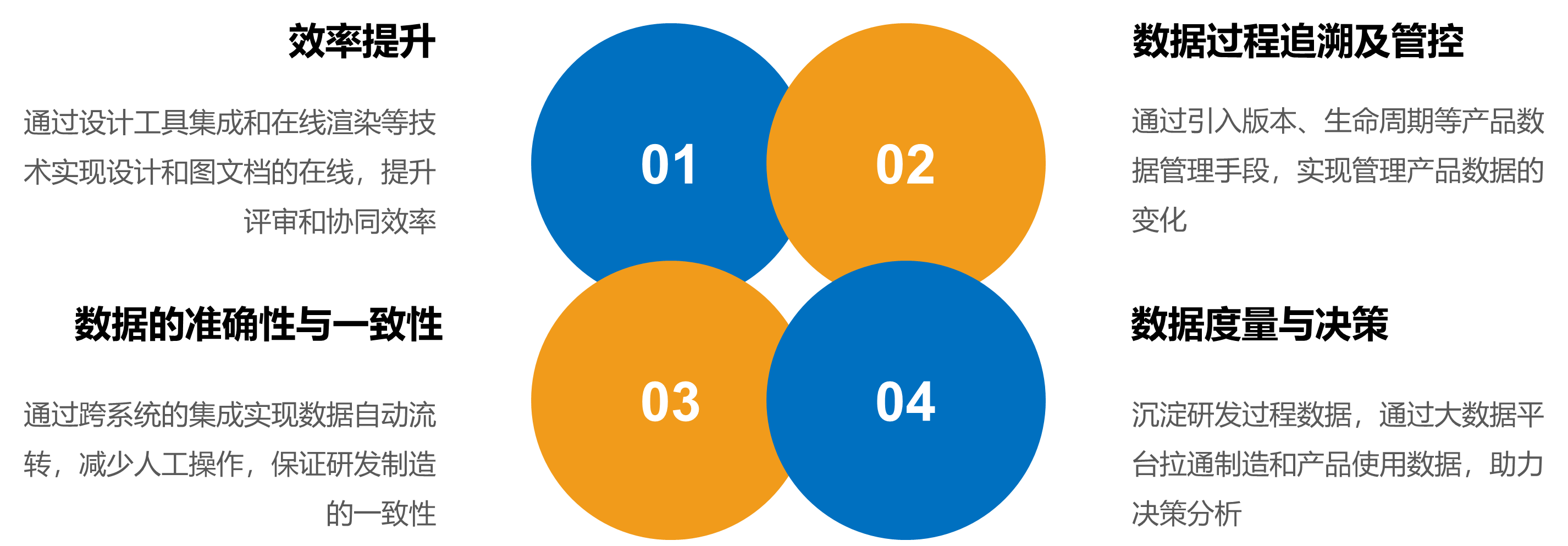 - 一体化&敏捷化:PLM平台与OA/ERP系统及Creo/AD工具集成,并建立产品研发过程管理机制,打破系统孤岛,实现数据共享。