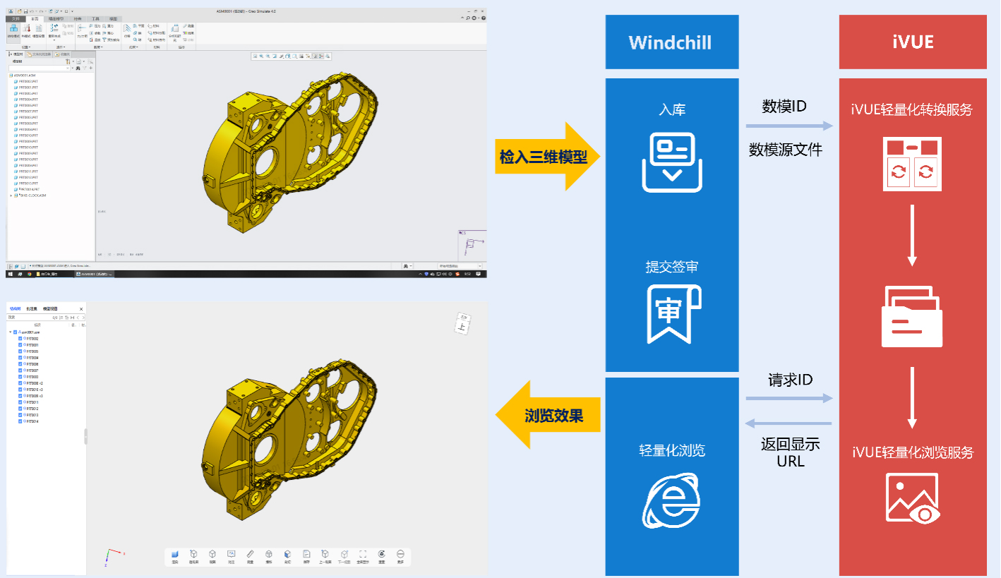 用户将数模从Creo检入至WindChill时,由WindChill同步将检入的数模文件传输至iVUE执行轻量化转换。iVUE转换执行完成后,将轻量化文件在iVUE中集中存储。