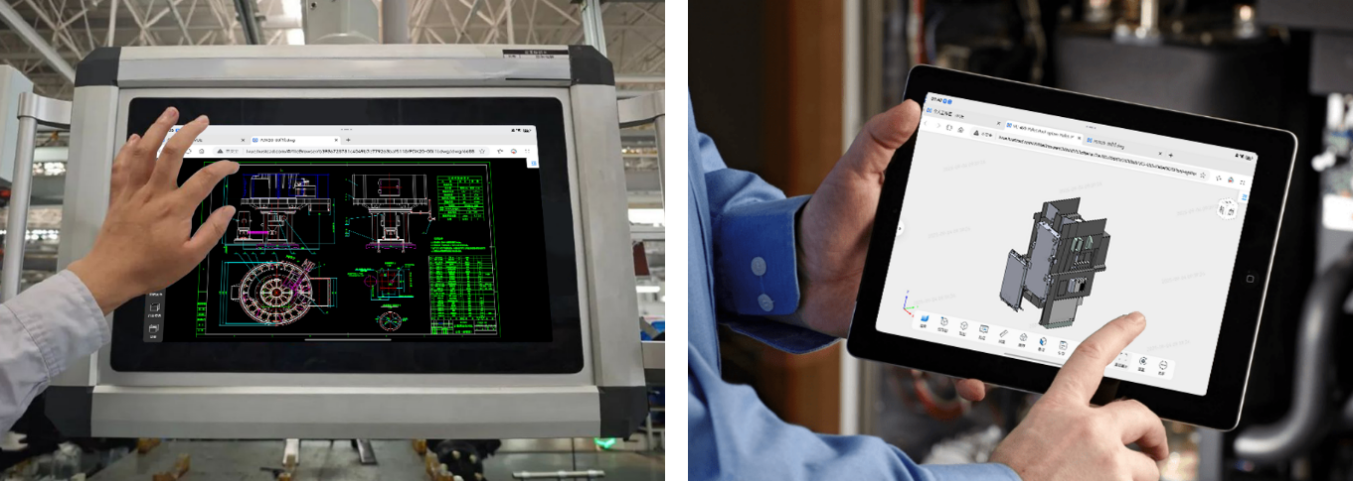 基于iVUE在线浏览方案,现场人员或工位用户,可以通过手持移动终端设备、工位大屏设备,在线预览二维图纸、三维数模。浏览过程不再依赖原生应用软件程序(如Creo、NX、SolidWorks、Catia、二维CAD软件等)及Windows操作系统环境,在满足业务需求的同时,有效降低了生产及服务环节的信息化软硬件投入成本。